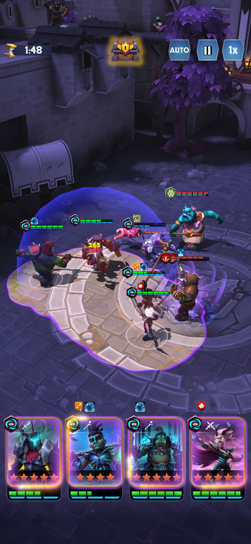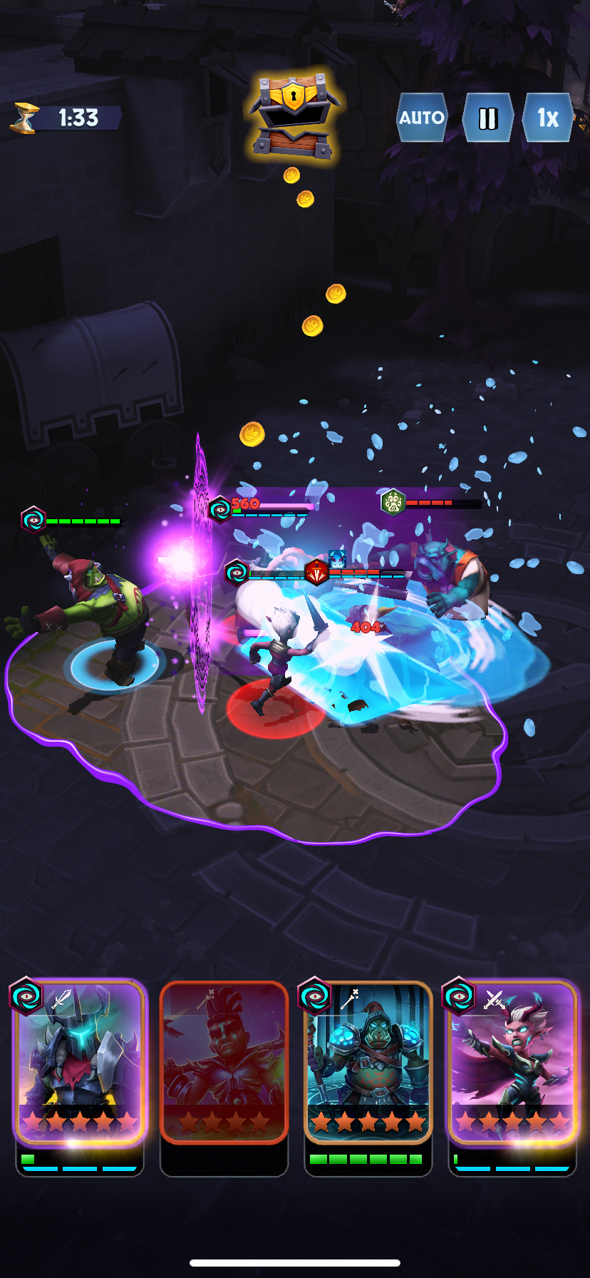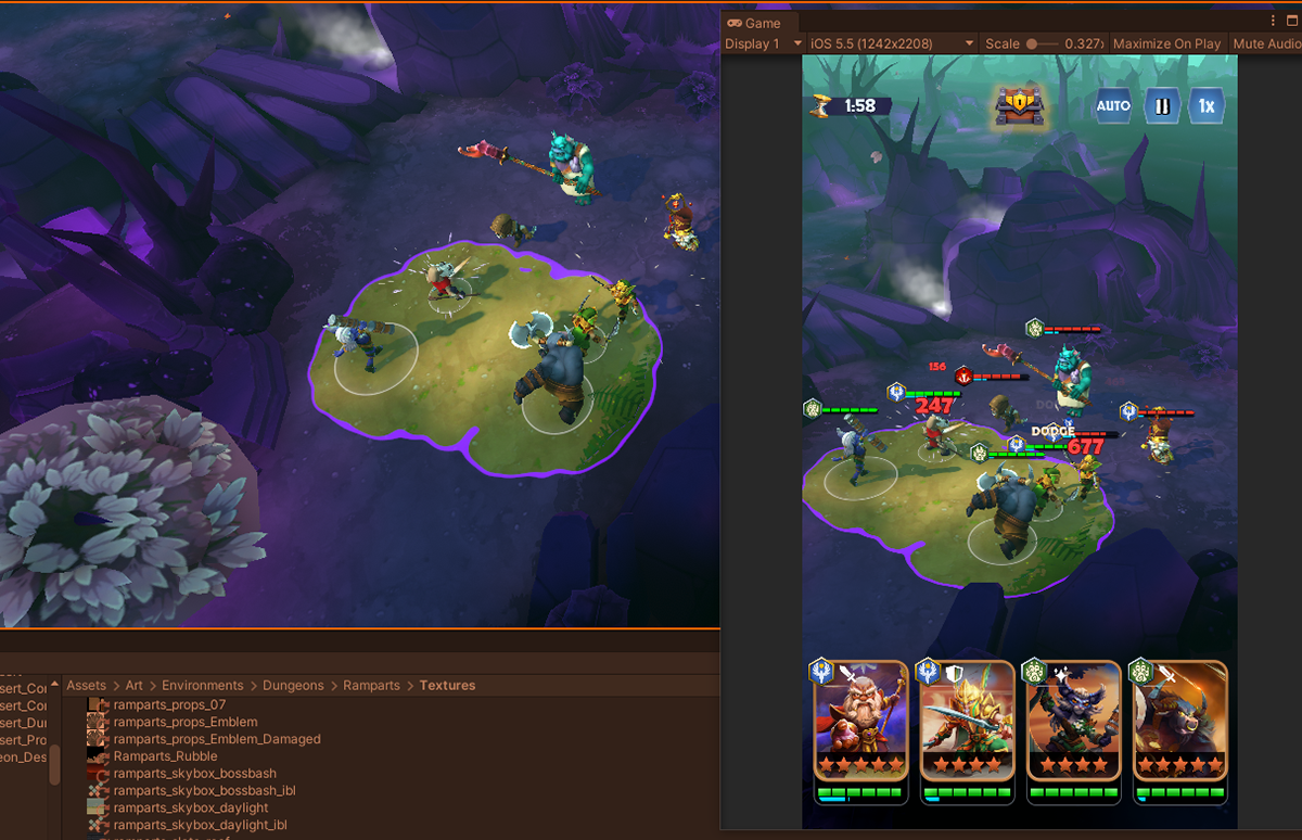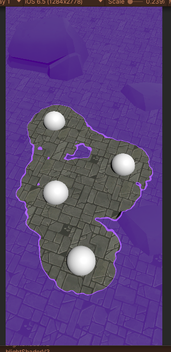 For Kingdom Boss, our design team asked for a separate track of levels that reused our existing environments. Narratively, it was a fight to push back "The Blight". I found some concept art from early in the project that inspired the look, then built a shader that respected where each of your four party members where in world space and tinted the rest of the environment: the heroes always kept the blight at bay!